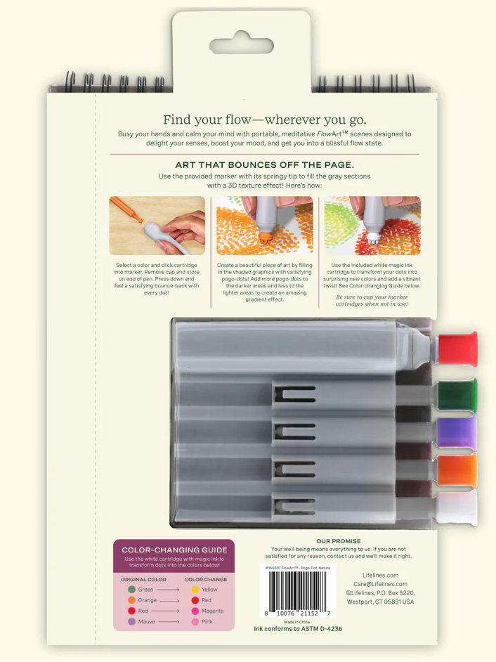 Pogo-Dot includes 20 meditative scenes and an innovative "pogo" marker with 4 interchangeable colors and 1 color-changing ink, all in a detachable storage tray. With each press, the delightfully bouncy pen adds multiple dots and gives a satisfying bounce-back. Layer dots to fill the page, creating a beautifully textured, dimensional scene; and, add color-changing ink to transform dots into new colors for a striking 3D effect. Compact and portable, this pad is perfect for calming your mind on-the-go, unwinding before bed, or taking a work or study break to de-stress.