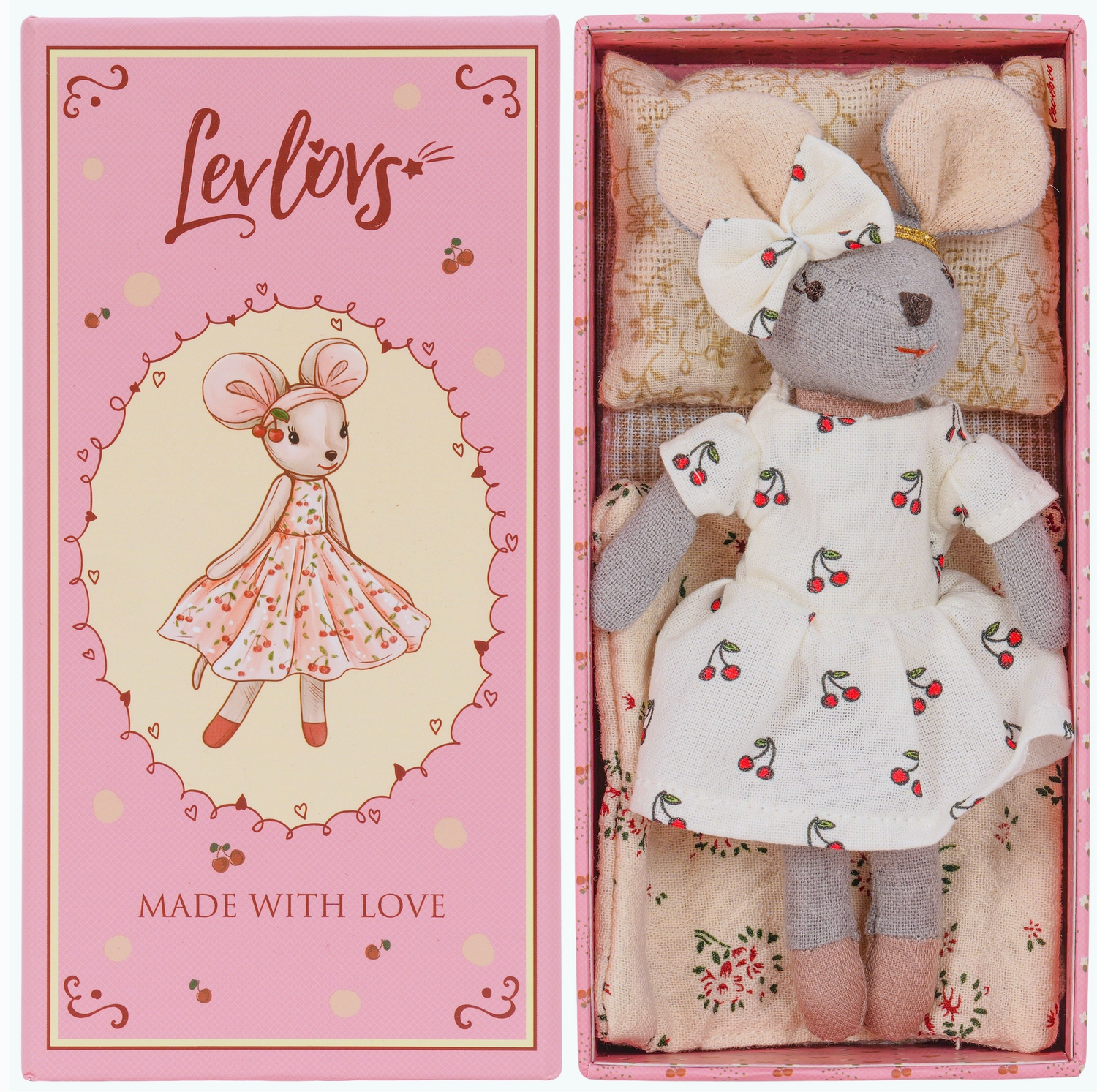 Meet our sweetest little mouse, dressed in a creamy white cherry-print dress and matching bow! Tucked cozily in her floral bedding inside a keepsake story box that reads “Made With Love,” she’s ready for cuddles, storytelling, and dreamy adventures.
