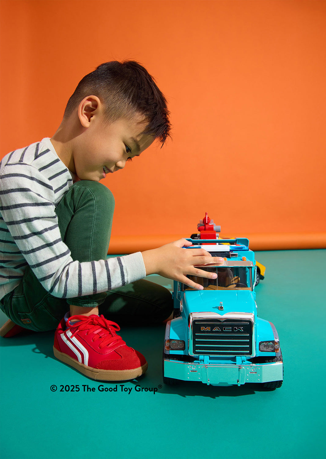Put imaginative kiddos behind the wheel of this impressive tow truck that has ALL the realistic functionality and built-to-last durability we love about Bruder toys. At a sizeable 26.5" x 8" x 12", this 1:16 scale tow truck is ready for years of indoor and outdoor play adventures. It even has a light and sound module with 4 realistic sounds and 5 interchangeable caps! Kiddos feel like they're operating the real thing with functional doors, storage compartments, flip-open engine hood, stabilizer legs, knob to raise and lower boom, telescoping main arm, and a fully functional cable winch with hooks. Attach the included bumper adapter to other Bruder vehicles for hours of towing pretend play! This is guaranteed to be a memory-making WOW gift! Includes 2 AAA batteries for the light and sound module.Ā