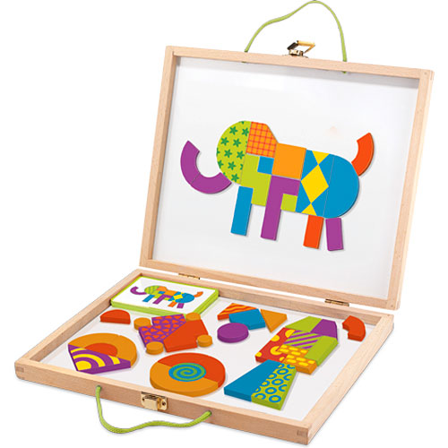 Going on a trip? This sturdy wood case contains everything needed for hours of play. The inside lid is magnetic, and so are the 42 wildly decorated wooden blocks. Kids can replicate 50 full-color puzzles, from animals to vehicles, and draw dry-erase backgrounds, too! For ages 3-7