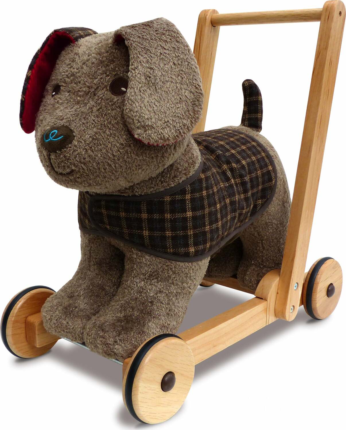 Percy is a soft and endearing plush puppy, which makes him a great walking companion. And with room for one on his back, he doubles as a great ride on too! Rubber tires on the solid wooden wheels ensures against slipping on smooth floors.