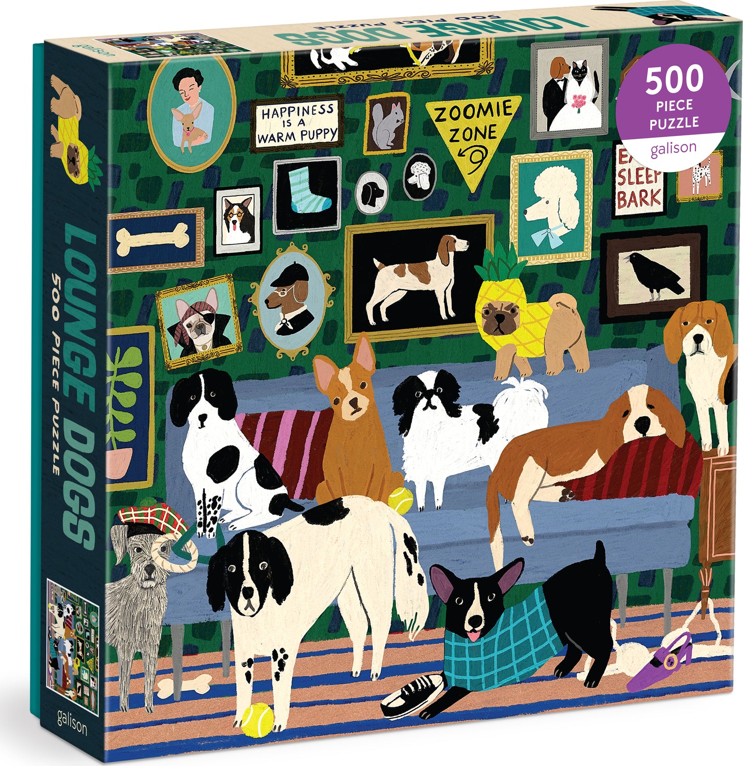 The Lounge Dogs 500 Piece Puzzle from Galison is a comical puzzle featuring a vignette of dogs transforming a living room into a dog lounge. This puzzle is fun for the whole family. Galison puzzles are packaged in matte-finish sturdy boxes, perfect for gifting, reuse, and storage.