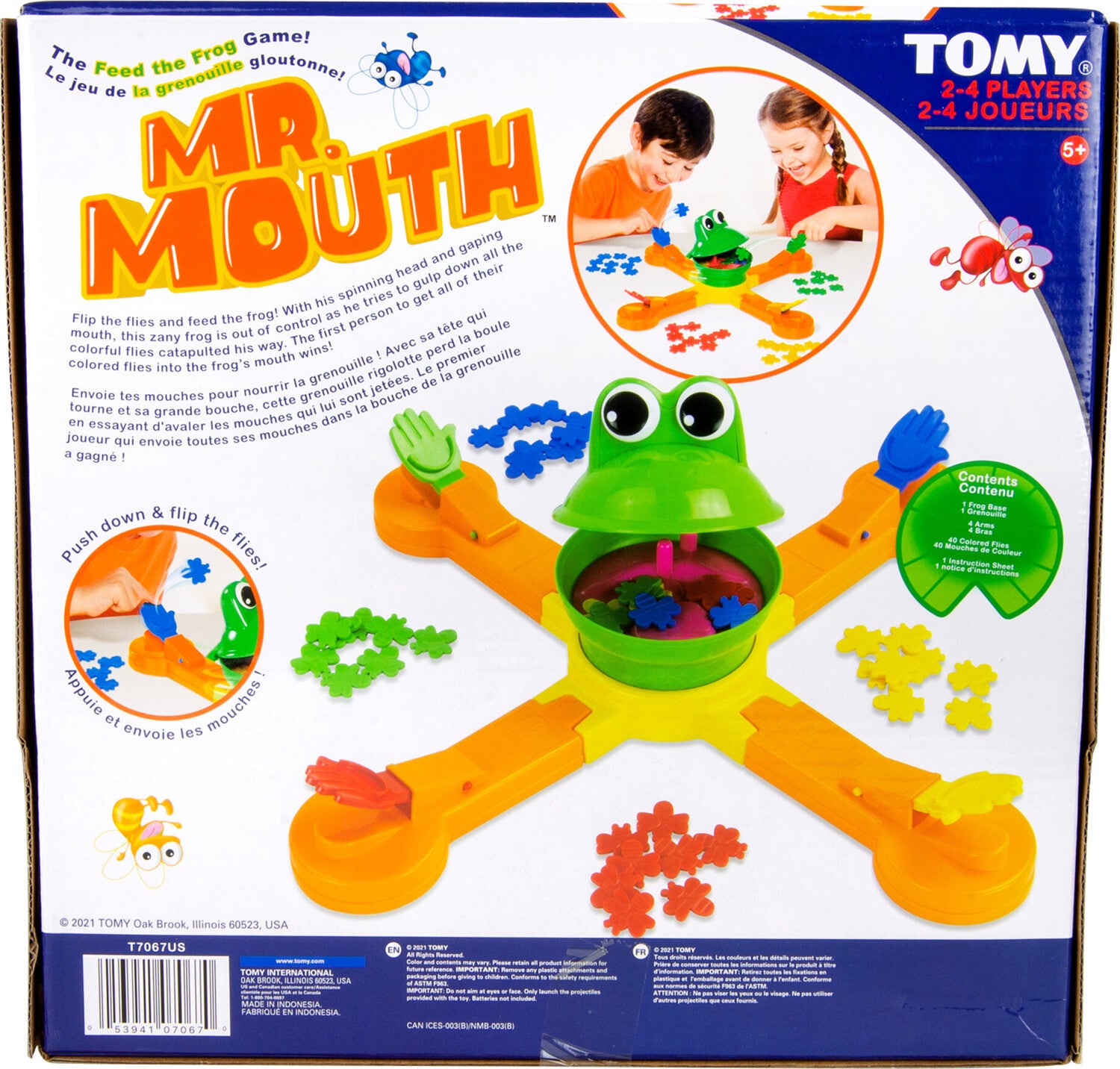 Catapulting insects has never been so much fun! Kids and adults alike will delight in flicking flies into this hungry frog's mouth. But that hyper hopper won't stay still! Mr. Mouth's funny frog head keeps opening, closing, and spinning. You'll need to choose your moment carefully to feed him with colorful bugs. The first player to feed all of their flies to Mr. Mouth wins! This classic game is suitable for ages 5 and up. Mr. Mouth comes with a plastic game base, a frog head, four flipping arms and 40 colorful flies.
