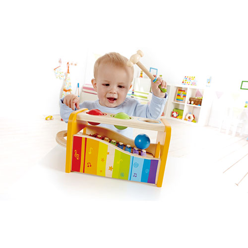 The timeless appeal of hammering objects through holes has a new, musical twist! When the colorful balls fall through, they land on and roll down a xylophone for a symphony of rewarding tones. Pull the âkeyboardâ out to play solo and youâve got two classic wooden toys. An award winner that employs dexterity, logic and cause & effect. What fun! From Hape Intl for ages 1-3 yrs.