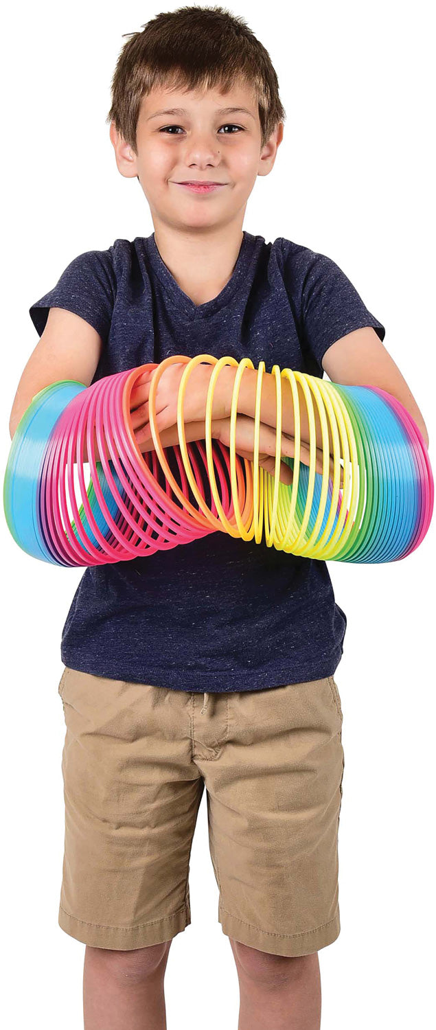 Spring into giant fun with an oversized rainbow spring! What games will kids create using this classic toy? Try stepping it down stairs, see how far it stretches, or use it for a classic game of telephone! Made of durable plastic, this 7" x 6.5" spring is a beautiful imagination starter.