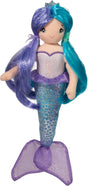 Catch a wave with Carly, our whimsical Sea Blue Mermaid soft toy! When it comes to fun at the seaside, Carly knows all the best games! Designed with playful, bright materials of varying textures, she features brushable teal and purple hair tied back with matching ribbons. Transparent purple chiffon and blue-speckled shimmer fabric lend a touch of under-the-sea excitement to her bodice and tail. Additional details include embroidered facial accents and a tiny crown atop her head.Ā